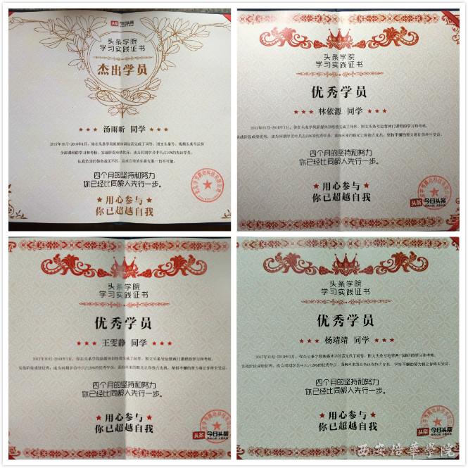 新学期第一周,我校新闻学专业汤雨昕等同学就拿到了头条学院新媒体训练营的优秀学员实践证书,这意味着在过去132天的实战练习中,他们的努力得到了头条学院新媒体训练营的肯定。