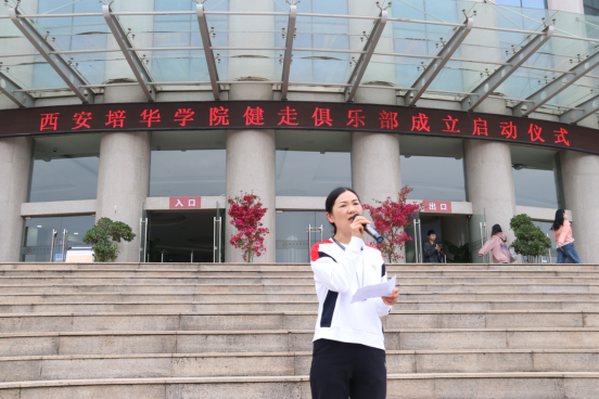 校财务总监薛清担任健走俱乐部主任并发言,她讲道:近年来,在理事长的号召下,我校“以人为本”的教职工健康服务体系逐步完善,全员健身的意识逐步增强,学校的各类教职工文体俱乐部也逐步成立,教职工身心健康水平得到了较大提升。健走活动是一项有益健康的健身活动,希望广大师生都能积极加入到健走俱乐部的队伍中,在这项运动中找到乐趣,结识更多的朋友,使全校健走运动爱好者以向上的生活态度、科学的生活观念、强健的身体素质积极面对生活,热情投入工作。