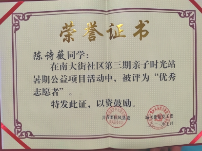 陈诗薇于2023年7月11日至7月21日在宝鸡市扶风县城关街道南大街社区幼儿“亲子时光站”做幼儿教师志愿者,主要负责辖区居民孩子暑期看护,丰富青少年儿童的暑假生活,带领辖区青少年进行游戏及外出参观。“要成为一名优秀的老师不仅要看习得多少知识,还要有各种能力的加持,爱心和耐心更是必不可少的基础。社会实践是引导我从大学生活走向社会的有效途径,让我真正理解了老师的含义。”