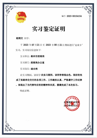 赵炳文于2023年7月21日至8月21日在陕西省彬州市招商局综合岗实践,帮助办公室接收文件,派送文件,制作招商PPT,并协助办公室工作人员完成日常工作。“这次实习让我明白生活中任何岗位都有它存在的意义,要懂得包容他人、理解他人。”