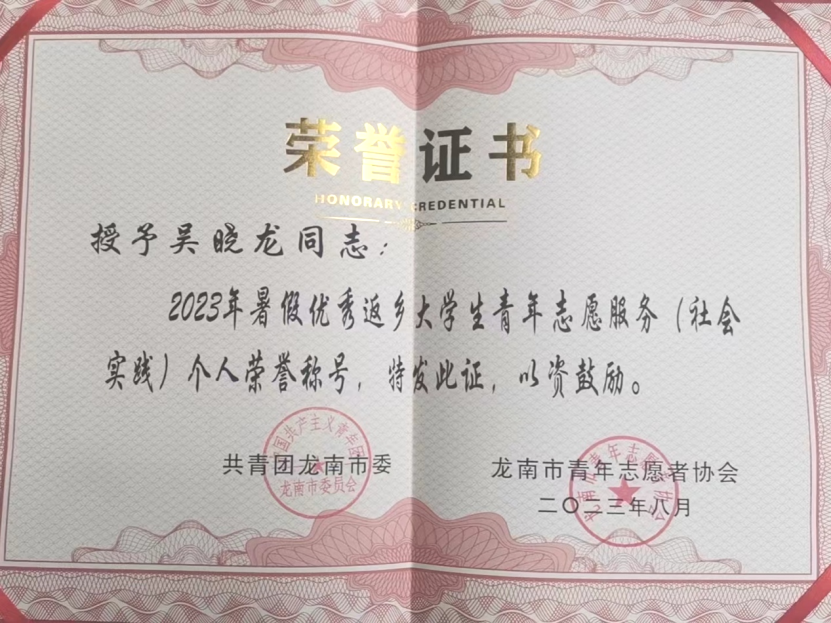 吴晓龙于2023年8月3日至8月23日在龙南市政务服务中心帮代办挂职实践,负责引导群众预约取号、使用自助服务机,协助配合大厅工作人员完成好各项工作。“通过在新时代文明实践的岗位服务,我深刻认识到政务服务是连接政府与人民群众之间的重要环节,感受到自己为社会公共事务贡献力量的价值和意义。同时提高了我自身适应社会、服务社会的能力,成为了我人生中一段难忘的经历。”