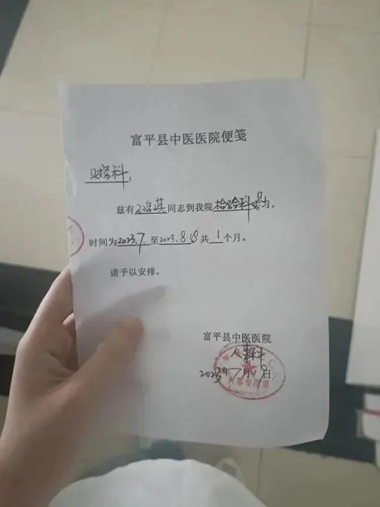 王瑞琪于2023年7月19日至2023年8月19日在富平县中医医院临床检验岗位实践。在此期间,王瑞琪熟练掌握静脉采血技术及三大常规检验方法;与病人接触学习建立良好医患关系。大量的实践机会让她的静脉采血技术稳步提升,为后续学习研究打下基础。“在见习老师的带领下,我顺利做到了血涂片的制备及染色。在与患者打交道的过程中也体会到了耐心的重要性。我会继续努力,不断进步,早日成为一名优秀的医务工作者。”