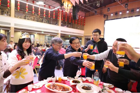 教职工们共同点燃生日蜡烛,唱响生日歌,许下心愿,分坐各桌的校领导们为大家切分蛋糕,送上美好祝福,现场被快乐温馨的氛围萦绕,欢声笑语一片。