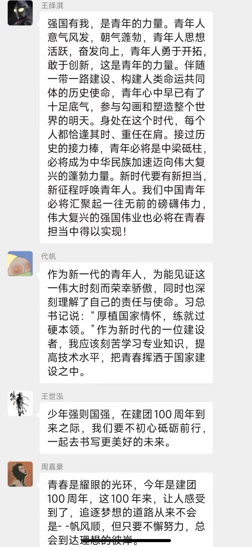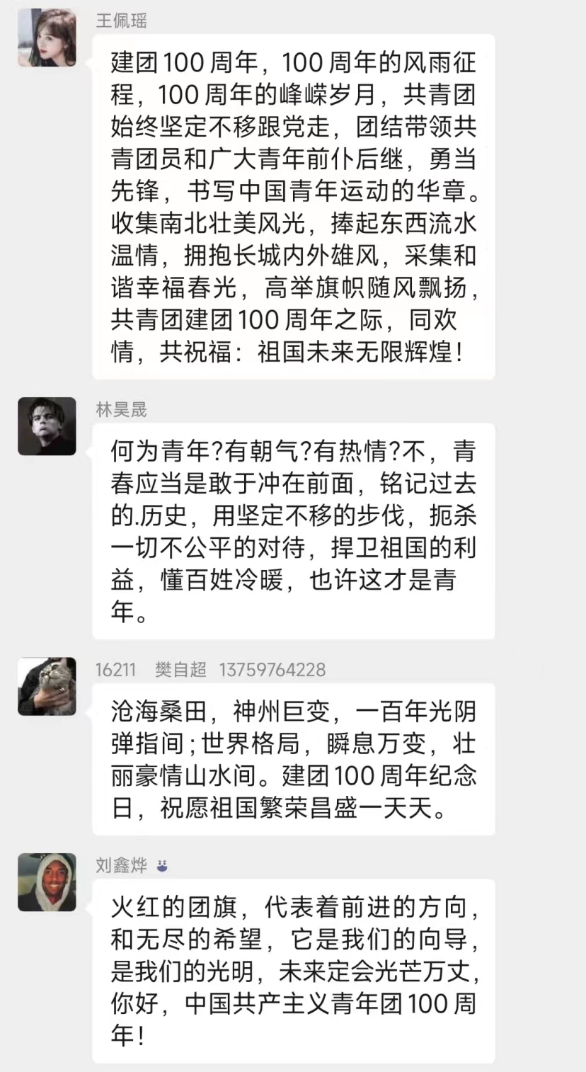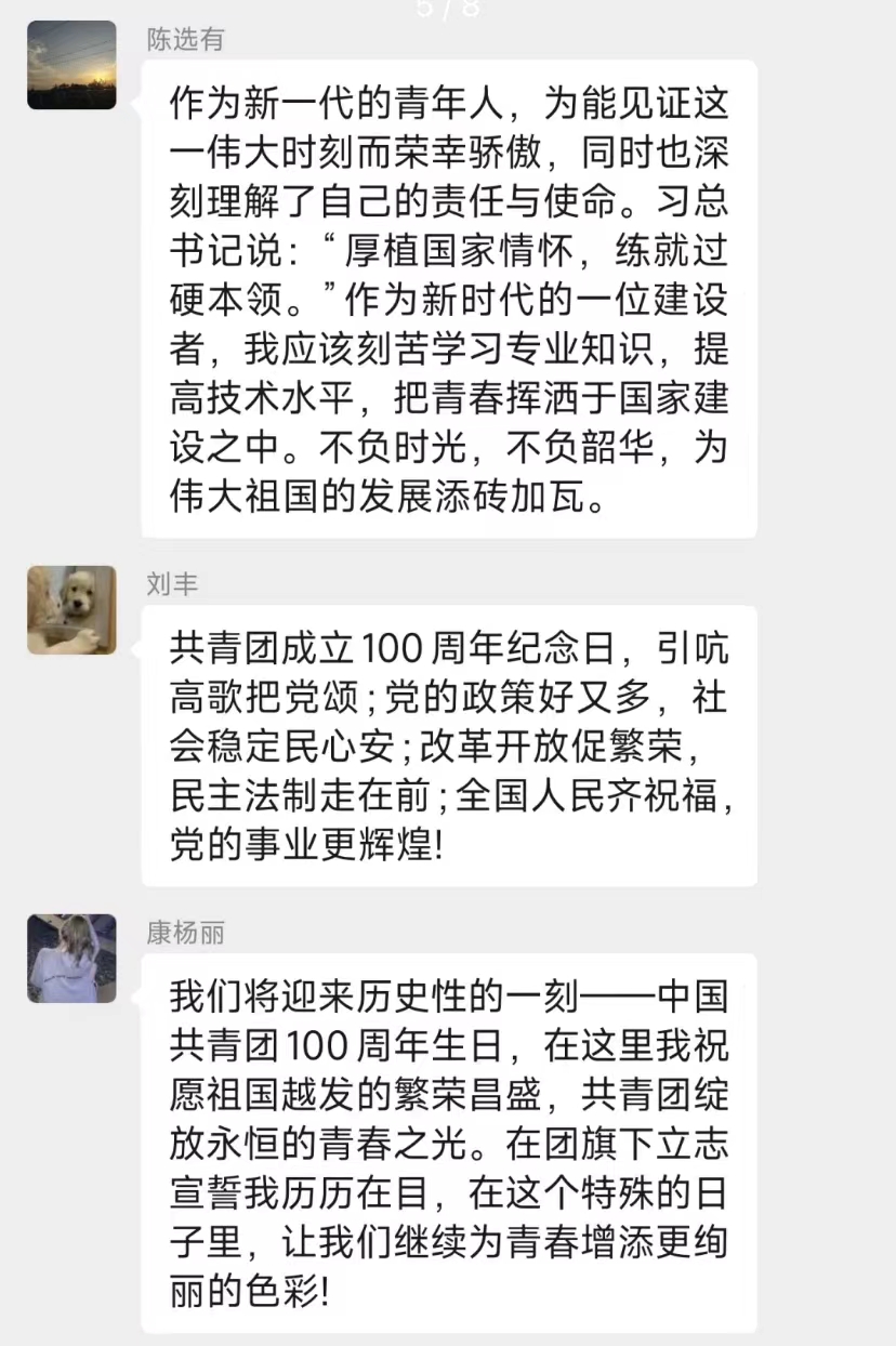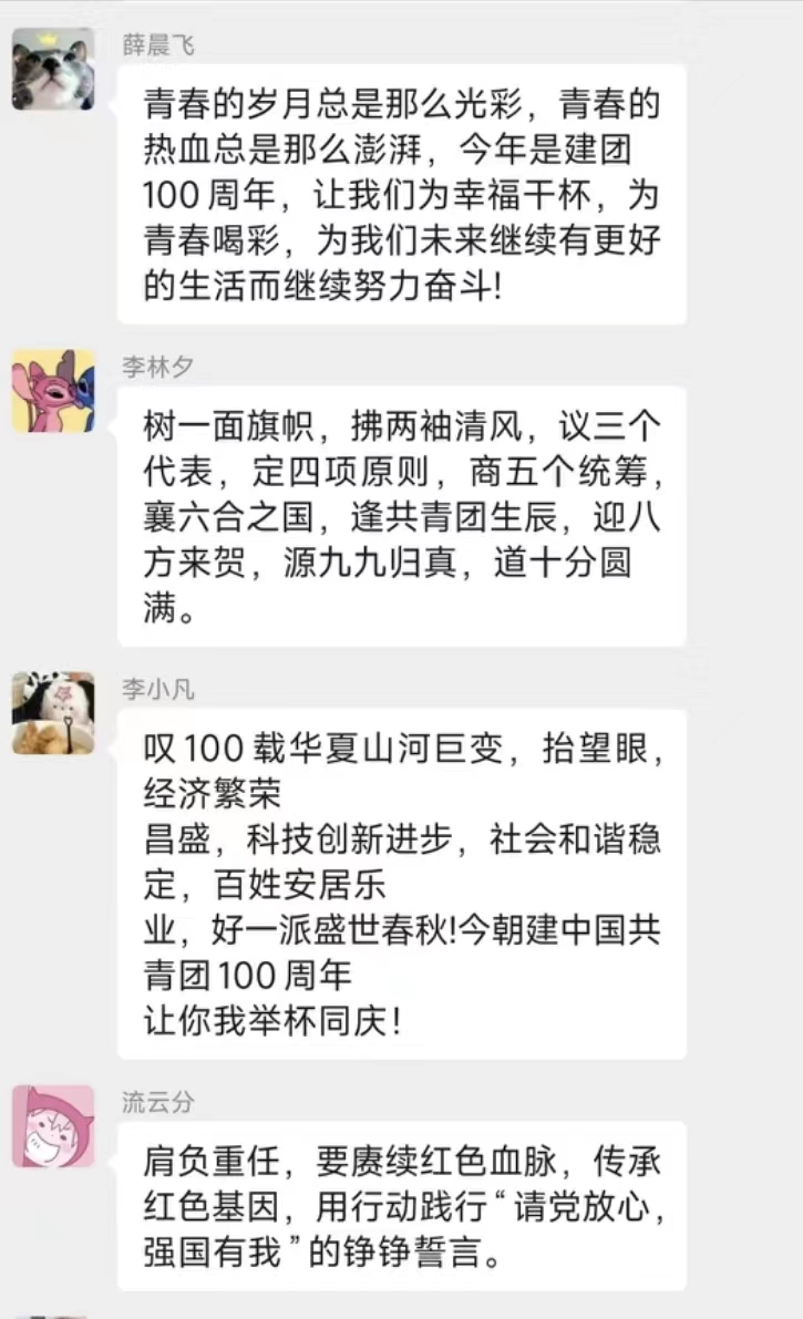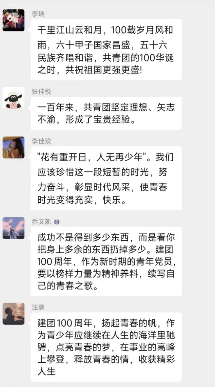 智能科学与信息工程学院各团员青年在支部群内发表感想,共同喊出了“请党放心,强国有我”的青春誓言。