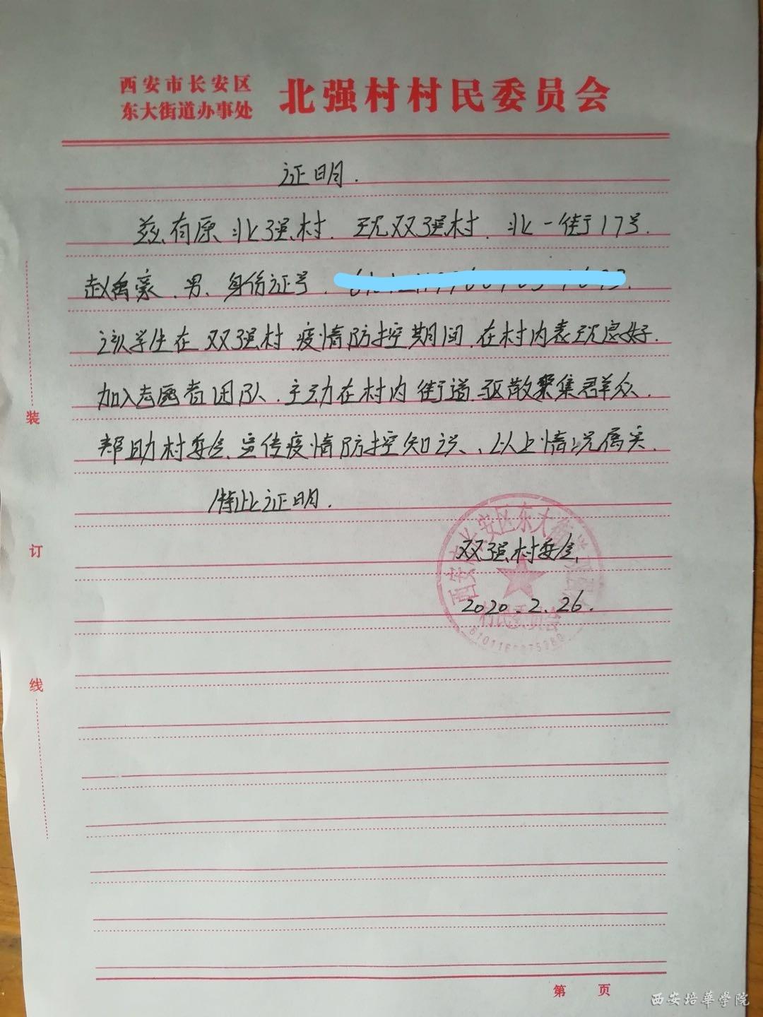 在接到防疫抗战的消息后,赵禹豪同学迅速行动,在西安市长安区双强村积极参加村委会安排下来的活动。他帮助村里拉横幅、贴公告、发微信、送资料,用实际行动开展新型冠状病毒感染的肺炎疫情防控工作。他说:“我在电视上看到许许多多优秀的共产党员主动前往一线,为一线构筑铜墙铁壁,我深深的被感动到了,我也要向他们一样,努力为人民服务,帮助我们村度过这次疫情”。