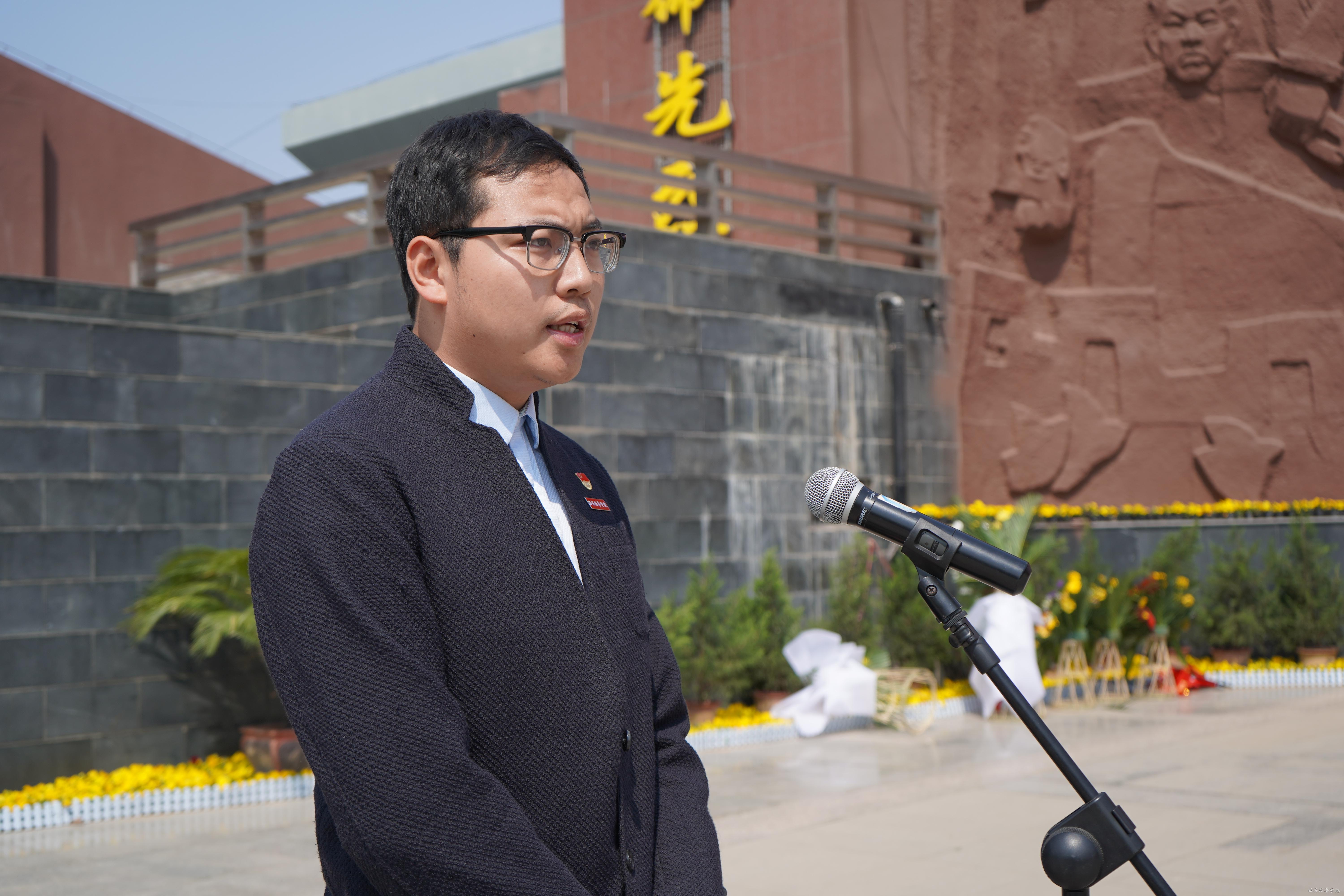 此次活动传媒学院师生前往烈士们的长眠处西安烈士陵园祭奠,献上一束鲜花,献上庄严的礼仪,也一并献上我们的赤诚感恩的心。走进陵园,我们怀着沉痛的心情有序的向烈士们进献鲜花,然后前往烈士纪念碑前进行祭扫仪式,祭扫仪式由卢立杰同学主持,田耕毓老师发言,他表示:“历史将会过去,但永远不该被遗忘。在那硝烟弥漫,战火纷飞的战争年代,革命先辈们,为了人民的幸福和祖国的解放事业,抛头颅,洒热血,英勇奋斗,前赴后继,赢得了人民的世代敬仰。”随后由学生代表敬献花圈,接着进入烈士纪念馆参观,田老师为大家进行了详细讲解。