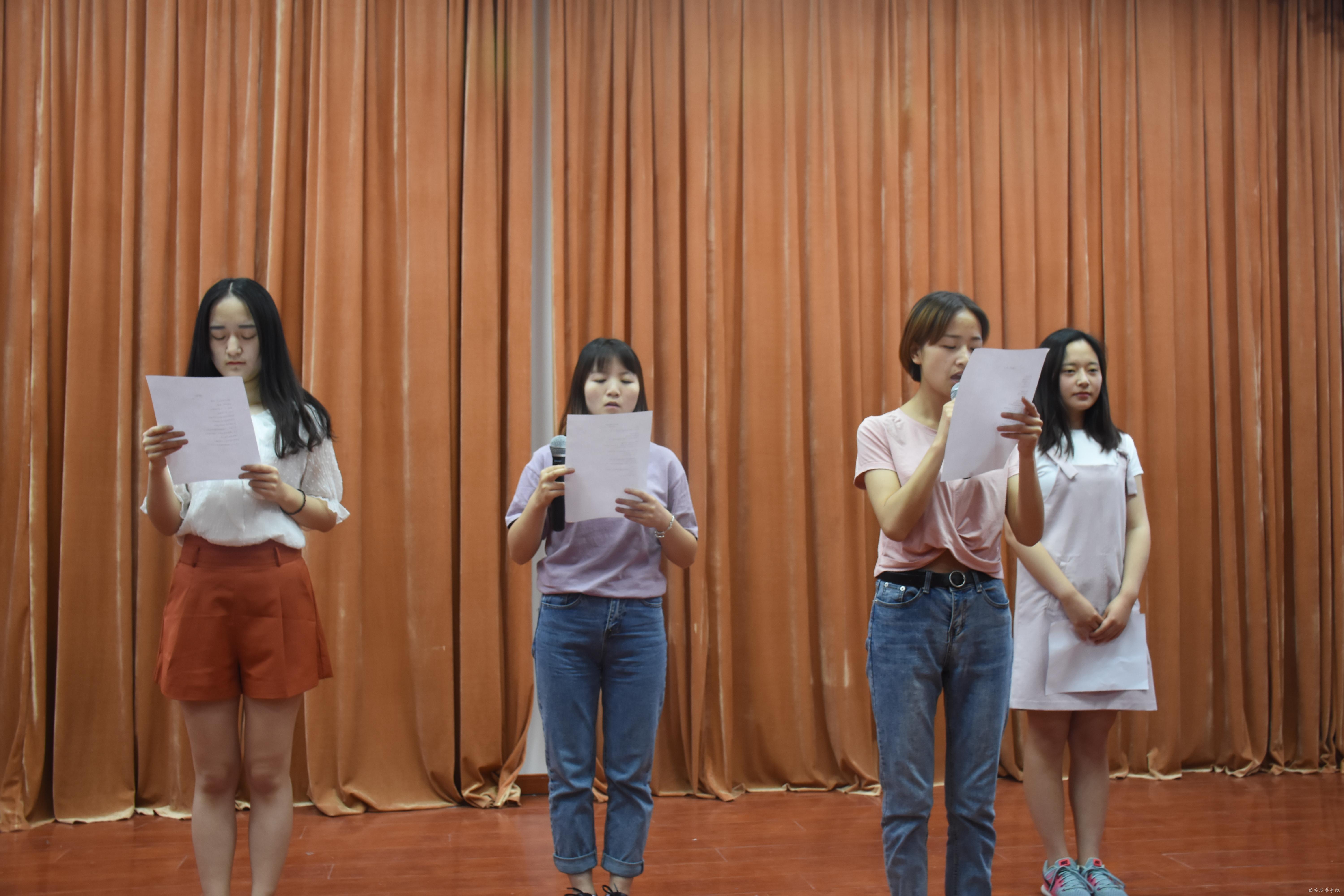 《致橡树》、《祖国啊我亲爱的祖国》、《握紧你的右手》、《席慕蓉诗组》、《摇摇晃晃的人间》、《我希望》、《路人》、《岁月 梦想》、《当你老了》、《青春好喜欢》、《永远记得你》、《死水》、《假如你不够快乐》、《月下》等优秀篇目或激情或深沉,都迎来了同学们阵阵掌声。特别是工作人员精心准备的小游戏迎来了朗诵会的高潮,八名同学分为两组,进行为时3分钟的诗歌创作,同学们文思泉涌,妙语连珠,引得现场爆笑连连。
