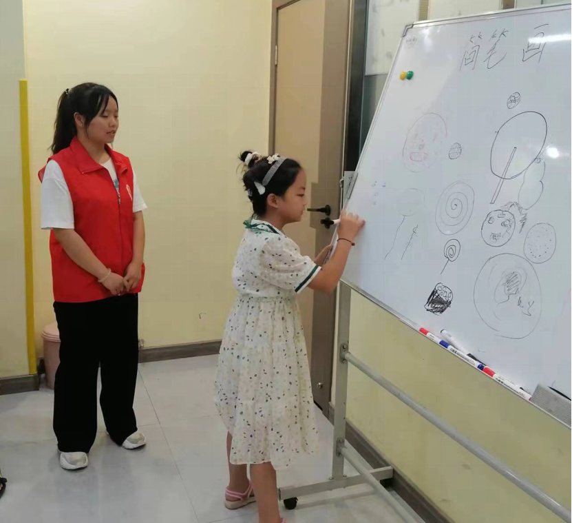 志愿者老师为同学们开设了绘画课,舞蹈课,家乡与社区课,体育课,课间时辅导学生作业。在绘画课上以一个圆圈为展开点,同学们发散想象,这个圆可以变成棒棒糖,气球,老鼠………下午的体育课上,由于户外气温过高,所以临时决定由室外活动转为室内理论教学,由孟老师为学生们讲解篮球基本理论知识,同学们兴趣高昂,积极踊跃参与课堂活动,对篮球产生了浓厚的兴趣。