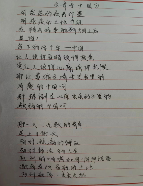 最后,李佳昆同学总结发言道:“中华优秀传统文化在微风中缓缓走来,在历史的长河中熠熠生辉,构成了一个民族的灵魂。品读古典诗文,让民族文化在我们的心中开花,品读古典诗文,让优秀的民族文化在我们的血脉之中流淌,让坚毅的民族精神指引我们成长。”