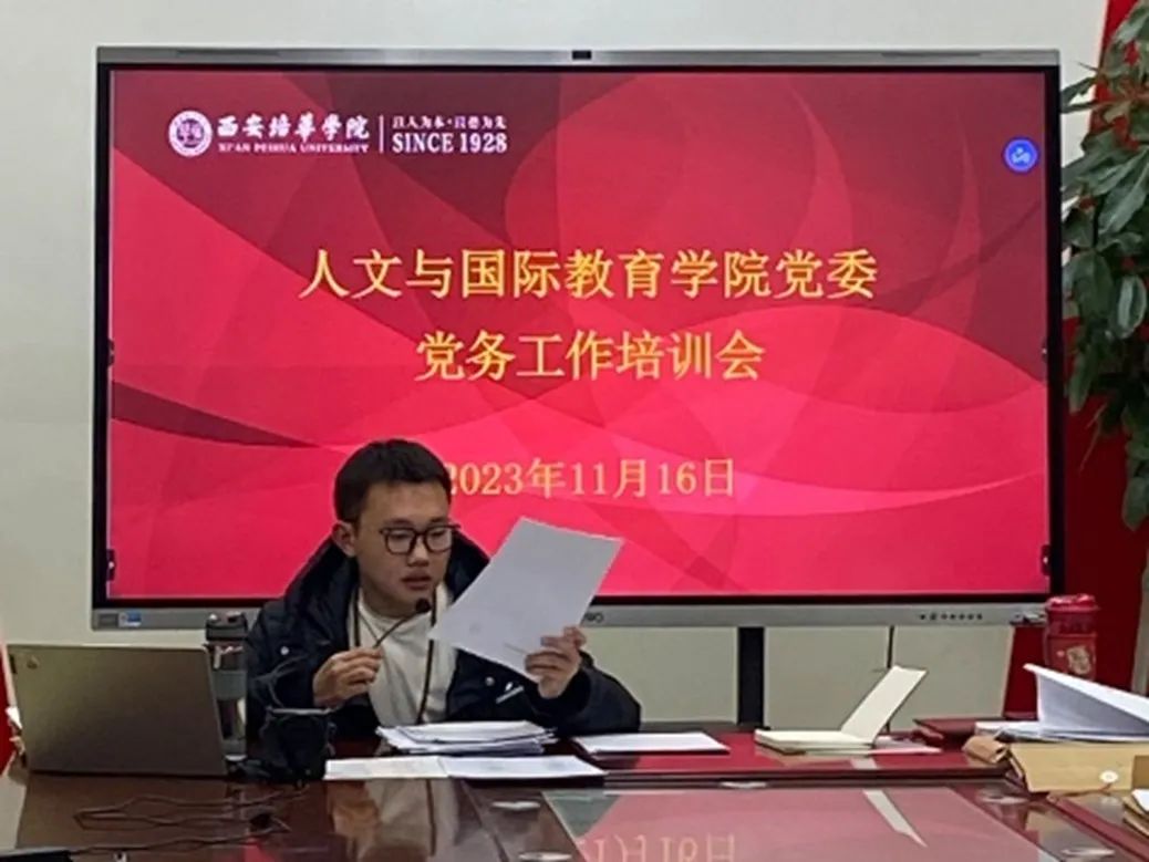 为加强学院党委的组织建设,进一步提升学院党务工作人员的综合素质,常检“自身不足”、“补短板”。2023年11月16日,人文与国际教育学院党委于格物楼1105会议室顺利召开学院党务工作培训会,白佳泠同志主持会议,各学生支部约50余名党务工作人员参加了此次培训。