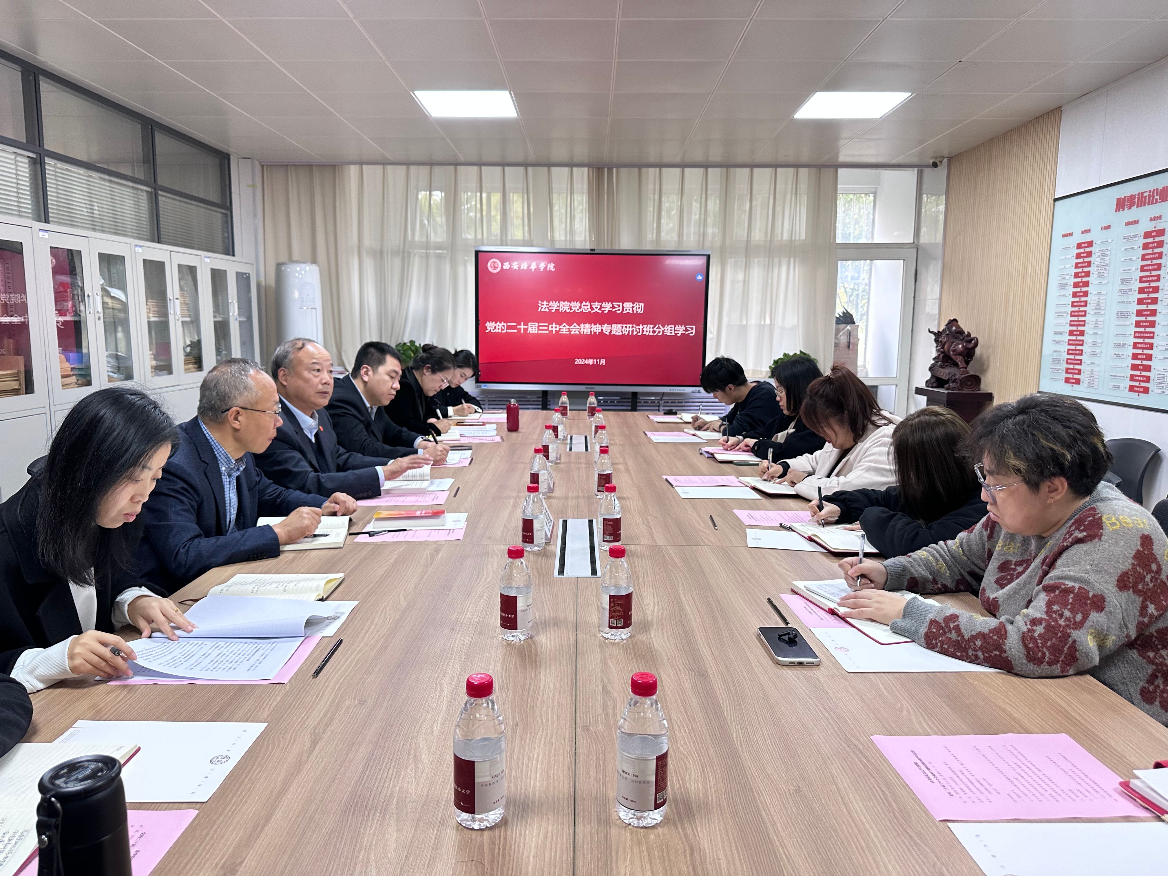 2024年11月6日-11月7日下午,法学院党总支在格物楼1116会议室开展学习贯彻党的二十届三中全会精神专题研讨班分组学习会议。西安培华学院党委书记刘锋、西安培华学院副校长罗新远、法学院领导班子成、学院党总支委员、师生党支部书记、党务干事以及教工党员代表参加了此次学习。会议由党总支书记兼行政副院长韩斌主持。