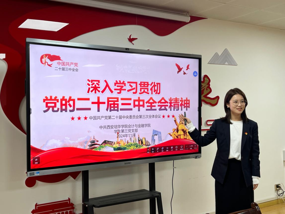 为深入学习贯彻党的二十届三中全会精神,深刻领会和把握进一步全面深化改革的主题、重大原则、重大举措、根本保证,会计与金融学院省级样板学生第三党支部于2024年11月11日在2115会议室举办了以“深入学习贯彻党的二十届三中全会精神”为主题的党日活动。
