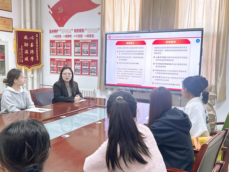 会上,支部书记冯贝首先传达了上级党组织关于深入贯彻中央八项规定精神学习教育的相关文件和指示要求,详细解读了中央八项规定的核心内容及其重要意义,她强调,深入贯彻中央八项规定精神是全面从严治党的一项重要任务,全体党员要提高政治站位,切实增强“四个意识”、坚定“四个自信”、做到“两个维护”,将中央八项规定精神内化于心、外化于行。同时,要结合医学院学生党员的实际,将学习教育成果转化为推动自身学习进步和为人民服务的动力,努力成为一名合格的共产党员。