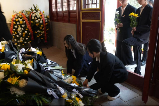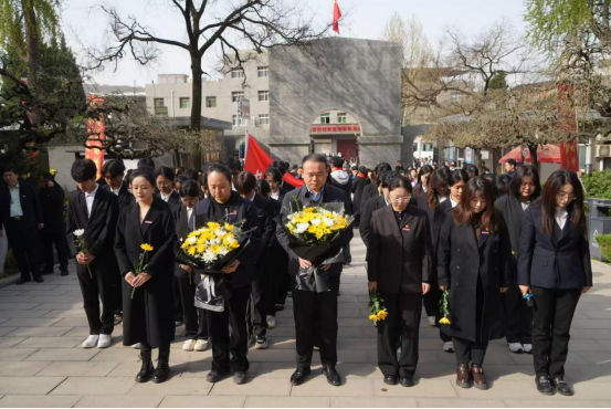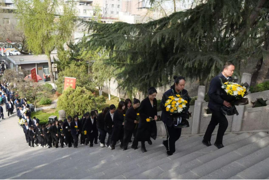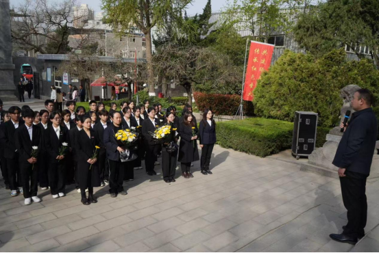 随后,全体人员在烈士纪念碑前整齐列队,怀着崇敬的心情行默哀礼,向为国家和人民英勇献身的烈士表达无尽的哀思与缅怀。默哀毕,刘斌书记、党务干事朱梦阳、党务专干孙宝丽、样板学生第三党支部书记王思思、学生第二党支部书记杨婷婷、团委副书记田晨及学生党员代表依次向烈士敬献花篮。众人双手持花,花束与花篮正对纪念碑,以最庄重的方式向烈士致敬。紧接着,全体人员集体三鞠躬,再次表达对革命先烈的敬仰与缅怀。
