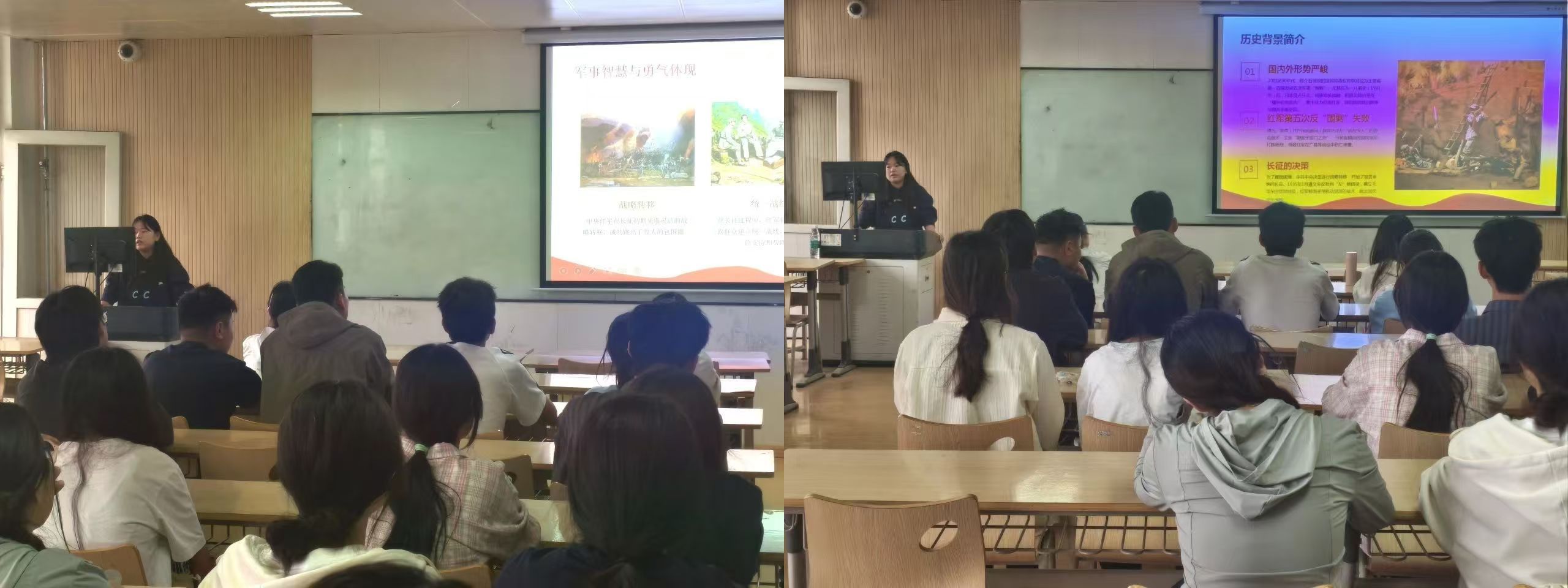 任邓冲同学带领同学们深入学习长征这段波澜壮阔的历史,深刻理解长征精神的内涵和价值,增强对马克思主义的信仰、对中国特色社会主义和共产主义的坚定信念。学习长征精神,能从中汲取战胜困难的勇气,培养吃苦耐劳、坚韧不拔的意志,以实际行动践行“为人民服务”的宗旨。通过生动讲述及视频播放,希望同学们能够更好地学习长征中先辈们勇于探索、敢于创新的精神,感受革命先辈的初心使命与家国担当,将个人理想与民族复兴伟业结合起来,厚植爱国情,砥砺强国志。