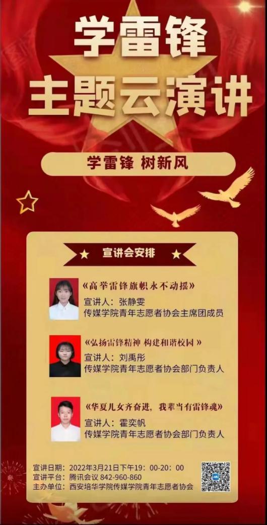 西安培华学院传媒学院青年志愿者协会于3月21日下午举行了学雷锋主题云演讲活动。活动由传媒学院青年志愿者协会主席团成员宋佳钰主持,张静雯、刘禹彤、霍奕帆三位同学先后进行了演讲,传媒学院团学青组织共计百余人参加。