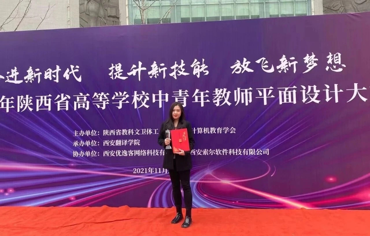 孙碧野老师自2019年2月于西安培华学院担任专职教师从事一线教学工作至今,工作中勤于学习,精于业务,甘于奉献,认真履行教师的崇高职责与使命。在2021年由陕西省教科文卫体工会、陕西省计算机教育学会主办的陕西省高等学校中青年教师平面设计大赛中脱颖而出,勇夺大赛特等奖。其设计的“峥嵘岁月、光辉百年”紧扣中国共产党百年奋斗历程这一主题,构思巧妙,匠心独运,技压群雄,拔得头筹!