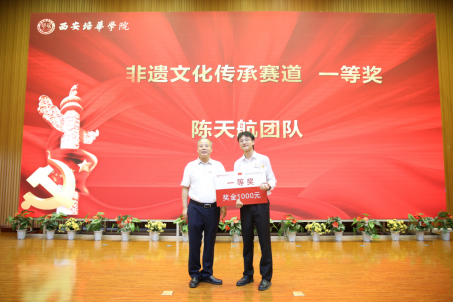 西安培华学院党委书记罗新远为非遗文化传承赛道一等奖获得者颁奖