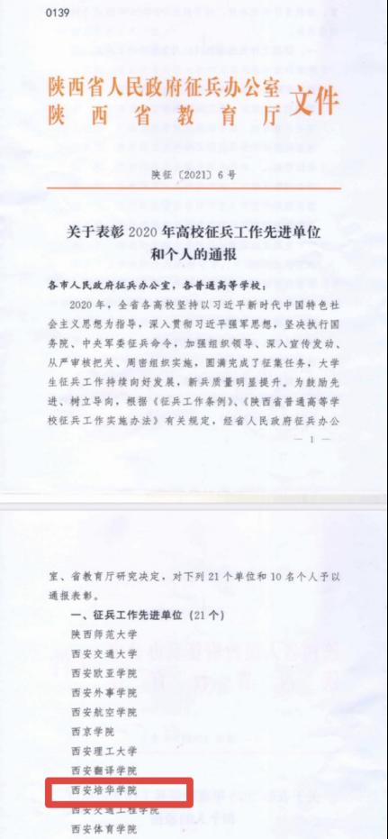 近日,陕西省人民政府征兵办公室通报表彰2020年度高校征兵工作先进单位和先进个人。我校因征兵工作成绩突出,荣获2020年度高校“征兵工作先进单位”荣誉称号,我校党委学生工作部(征兵工作站)黄珂同志因成绩突出,被西安市雁塔区国防动员委员会评为“2020年度民兵整组工作征兵工作先进个人”。