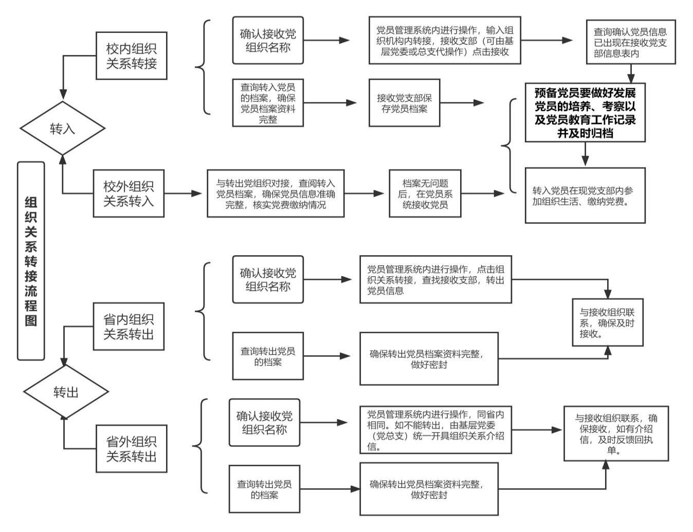 2.校内组织关系转出需要确认接收党组织名称,在党员管理系统内进行操作,同时接收转入党员的档案资料,并编入党支部参加党员组织活动。