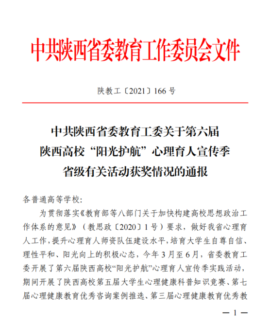 根据《中共陕西省委教育工委关于第六届陕西高校“阳光护航”心理育人宣传季省级有关活动获奖情况的通报》(陕教工〔2021〕166号)的文件,学校建筑与艺术设计学院辅导员赵煜柠的案例《上天会拯救我——一例大学生过度迷信错误认知咨询案例报告》荣获“陕西高校第七届心理健康教育优秀咨询案例三等奖”;