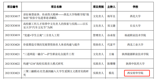 根据《关于公布2021年度陕西高校学生工作精品项目和研究课题立项名单的通知》的文件,学校党委学生工作部蔡亮主持的《三聚三融联动:红色基因融入大学生爱国主义教育实践研究》获得“学生工作精品项目”立项,传媒学院高嘉炜主持的《新时代陕西民办高校辅导员培训体系构建研究》获得“学生工作研究课题”立项。