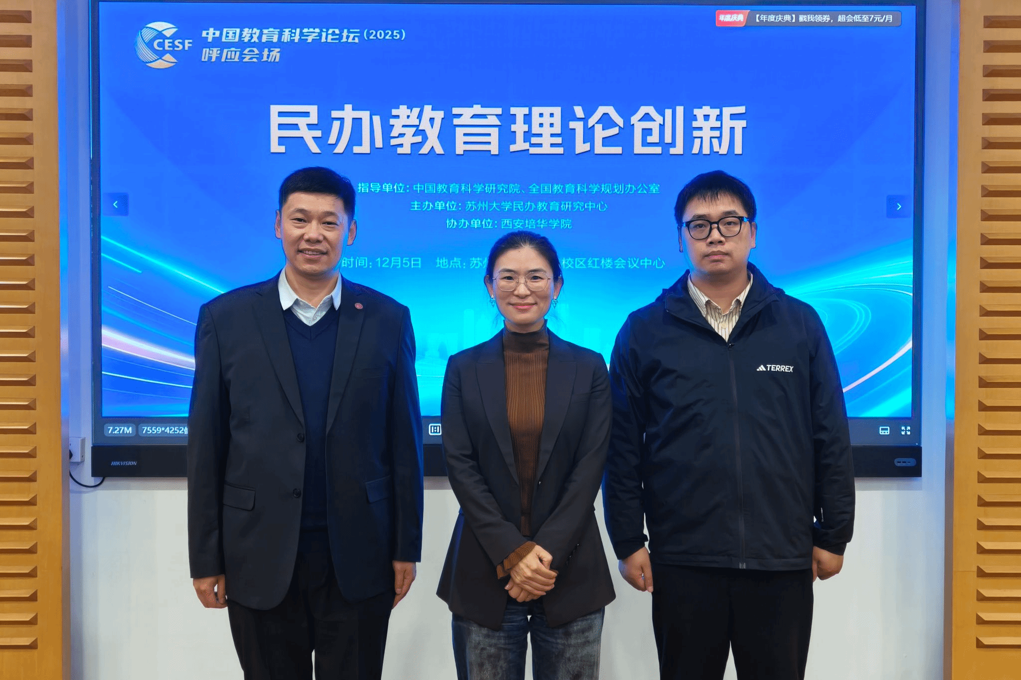 2025年12月5日,由中国教育科学研究院、全国教育科学规划办公室指导,苏州大学民办教育研究中心与西安培华学院联合举办的“中国教育学知识体系构建视阈下的民办教育理论创新研讨会”在苏州大学天赐庄校区顺利举行。本次会议汇聚了国内民办教育研究领域的知名学者与专家,围绕新时代民办教育高质量发展的理论创新与实践路径展开深入交流与研讨。学校党委副书记蔡亮、马克思主义学院青年教师王朋参加现场会议。