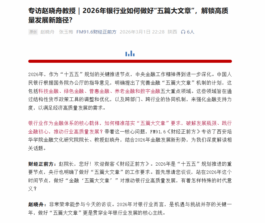 近日,西安培华学院金融文化研究院院长赵晓舟教授受邀做客FM91.6《财经正前方》栏目,围绕2026年银行业如何精准落实“科技金融、绿色金融、普惠金融、养老金融、数字金融”五篇大文章要求,结合最新金融形势进行深度解读,展现出我校学者服务地方经济社会发展的专业智慧与责任担当。