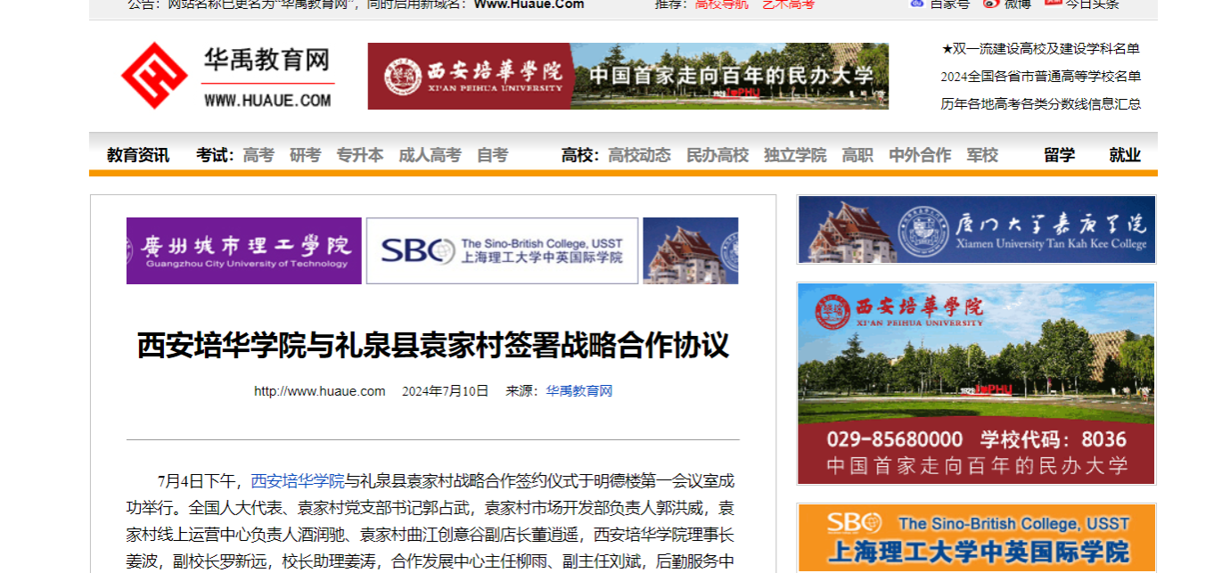 7月4日下午,西安培华学院与礼泉县袁家村战略合作签约仪式于明德楼第一会议室成功举行。全国人大代表、袁家村党支部书记郭占武,袁家村市场开发部负责人郭洪威,袁家村线上运营中心负责人酒润驰、袁家村曲江创意谷副店长董逍遥,西安培华学院理事长姜波,副校长罗新远,校长助理姜涛,合作发展中心主任柳雨、副主任刘斌,后勤服务中心主任张静远出席仪式。仪式由西安培华学院校长助理秦海锋主持。