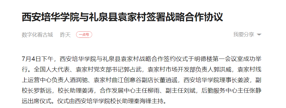 7月4日下午,西安培华学院与礼泉县袁家村战略合作签约仪式于明德楼第一会议室成功举行。全国人大代表、袁家村党支部书记郭占武,袁家村市场开发部负责人郭洪威,袁家村线上运营中心负责人酒润驰、袁家村曲江创意谷副店长董逍遥,西安培华学院理事长姜波,副校长罗新远,校长助理姜涛,合作发展中心主任柳雨、副主任刘斌,后勤服务中心主任张静远出席仪式。仪式由西安培华学院校长助理秦海锋主持。
