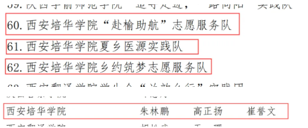 其中,西安培华学院荣获省级示范学校,学校“赴榆助航”志愿服务队、夏乡医源实践队、乡约筑梦志愿服务队荣获省级优秀团队,人文与国际教育学院老师朱林鹏、培华学子高正扬和崔誉文获省级先进个人。