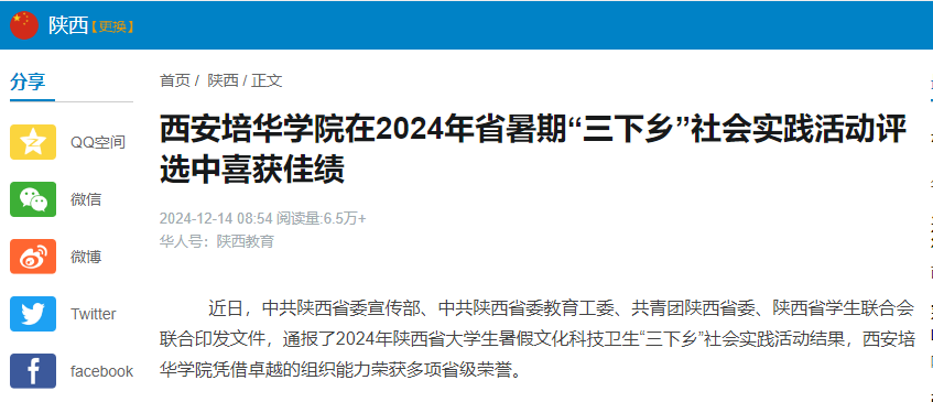 近日,中共陕西省委宣传部、中共陕西省委教育工委、共青团陕西省委、陕西省学生联合会联合印发文件,通报了2024年陕西省大学生暑假文化科技卫生“三下乡”社会实践活动结果,西安培华学院凭借卓越的组织能力荣获多项省级荣誉。