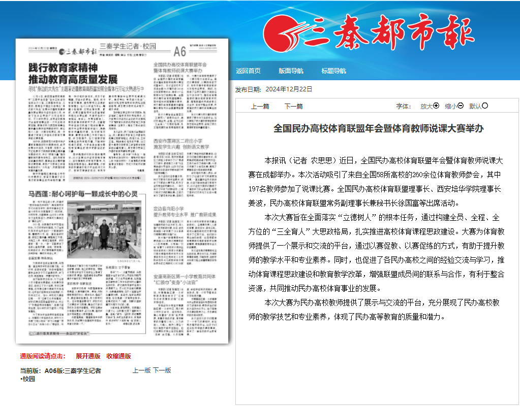 本报讯(记者 农思思)近日,全国民办高校体育联盟年会暨体育教师说课大赛在成都举办。本次活动吸引了来自全国58所高校的260余位体育教师参会,其中197名教师参加了说课比赛。全国民办高校体育联盟理事长、西安培华学院理事长姜波,民办高校体育联盟常务副理事长兼秘书长徐国富等出席活动。
