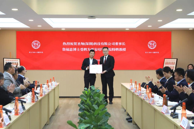 12月22日,西安培华学院特聘教授聘任暨校企合作集中签约仪式在西安成功举行。中国印钞造币集团有限公司党委书记、董事长杨立杰,华夏鲲鹏集团董事局主席邓图全,世界华商投资基金会主席马兴利,圣翔(深圳)科技有限公司董事长詹福忠,泛美集团董事长魏全斌,世界华人协会主席张雨轩等领导和嘉宾,西安培华学院理事长姜波等学校领导和相关职能部门负责人、二级学院师生代表参加。副校长罗新远主持活动。