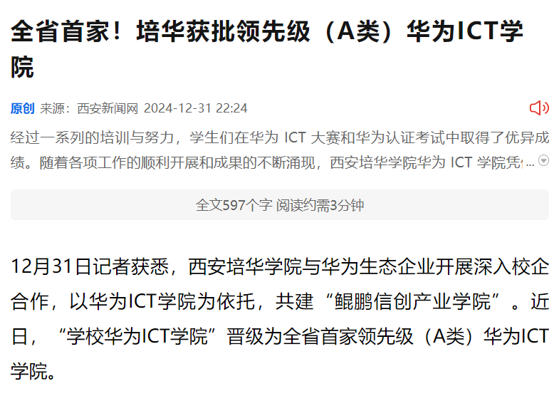 经过一系列的培训与努力,学生们在华为 ICT 大赛和华为认证考试中取得了优异成绩。随着各项工作的顺利开展和成果的不断涌现,西安培华学院华为 ICT 学院凭借出色的表现,由原先的优选级晋级为领先级,成为全省首家领先级(A 类)华为 ICT 学院。