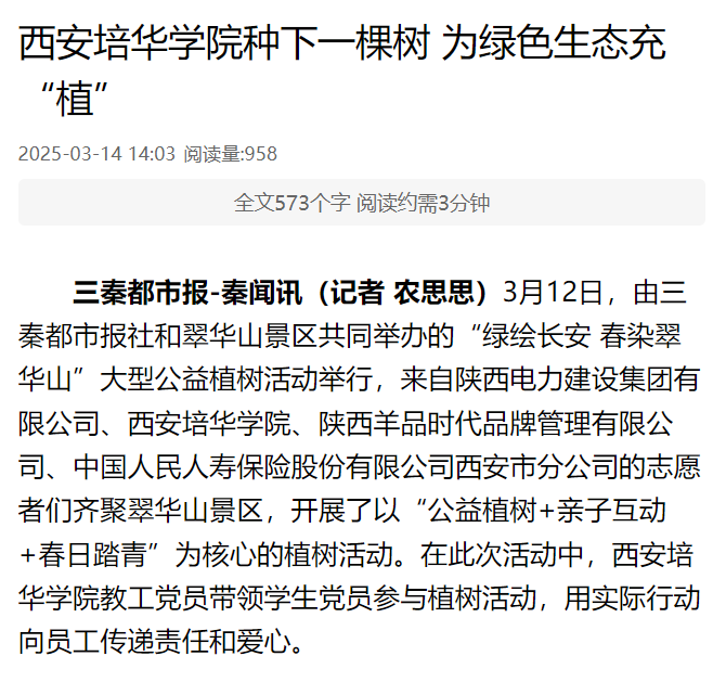 三秦都市报-秦闻讯(记者 农思思)3月12日,由三秦都市报社和翠华山景区共同举办的“绿绘长安 春染翠华山”大型公益植树活动举行,来自陕西电力建设集团有限公司、西安培华学院、陕西羊品时代品牌管理有限公司、中国人民人寿保险股份有限公司西安市分公司的志愿者们齐聚翠华山景区,开展了以“公益植树+亲子互动+春日踏青”为核心的植树活动。在此次活动中,西安培华学院教工党员带领学生党员参与植树活动,用实际行动向员工传递责任和爱心。
