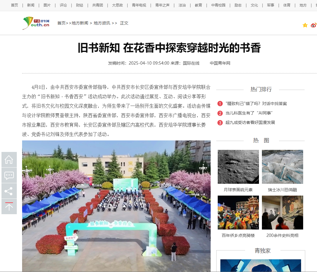 4月8日,由中共西安市委宣传部指导,中共西安市长安区委宣传部与西安培华学院联合主办的“旧书新知·书香西安”活动成功举办。此次活动通过展览、互动、阅读分享等形式,将旧书文化与校园文化深度融合,为师生带来了一场别开生面的文化盛宴。活动由传媒与设计学院教师贾登银主持,陕西省委宣传部,西安市委宣传部,西安市广播电视台,西安市报业集团,西安市教育局,长安区委宣传部及辖区内高校代表,西安培华学院理事长姜波、党委书记刘锋及师生代表参加了活动。