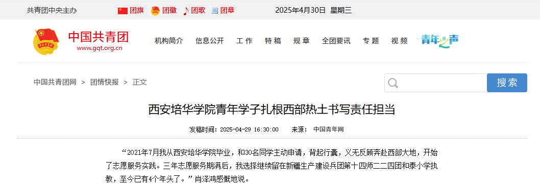 西安培华学院于在风起云涌的大革命时代诞生,在抗战烽火中升华,在共和国旗帜下成长,在改革开放浪潮中奋进,在新时代逐梦中图强。一代代培华人用救国之心、爱国之举、报国之情、兴国之梦、强国之志创建了培华昨天的辉煌,描绘了培华明天的希望。历史的接力棒又交到新一代培华人手上。迈步在中华民族伟大复兴征程上的培华青年用行动证明:选择基层不是选择平凡,而是选择成为时代的脊梁;扎根西部不是单向奉献,而是在广阔天地中实现人生价值的升华。这种双向奔赴,正是新时代青年最动人的姿态。