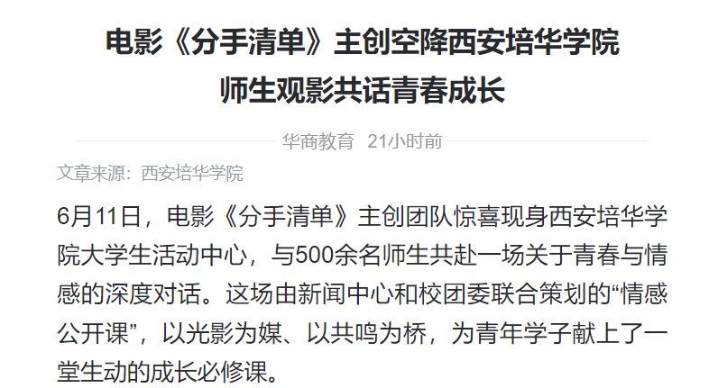 6月11日,电影《分手清单》主创团队惊喜现身西安培华学院大学生活动中心,与500余名师生共赴一场关于青春与情感的深度对话。这场由新闻中心和校团委联合策划的“情感公开课”,以光影为媒、以共鸣为桥,为青年学子献上了一堂生动的成长必修课。