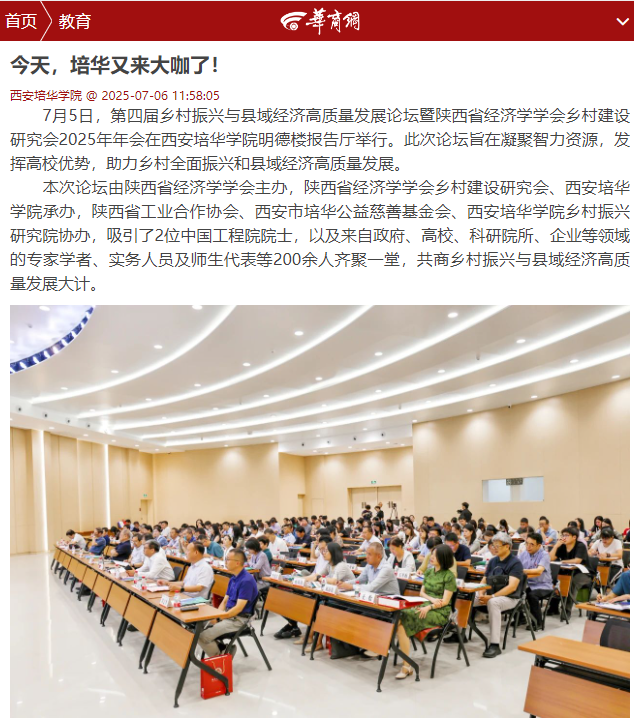 7月5日,第四届乡村振兴与县域经济高质量发展论坛暨陕西省经济学学会乡村建设研究会2025年年会在西安培华学院明德楼报告厅举行。此次论坛旨在凝聚智力资源,发挥高校优势,助力乡村全面振兴和县域经济高质量发展。