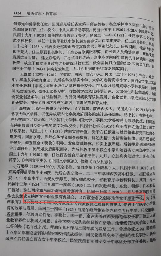 中华人民共和国地方志丛书《陕西省志-教育志》中记载吴云芳、梁午峰、石雨琴等人举办了西安第一女子平民职业学校(后改名培华女子职业学校)的事迹