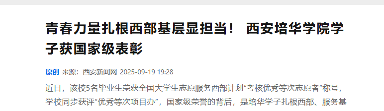 “到西部去,到基层去,到祖国最需要的地方去!”这句铿锵誓言,正由西安培华学院的青年学子们用行动践行。近日,该校5名毕业生荣获全国大学生志愿服务西部计划“考核优秀等次志愿者”称号,学校同步获评“优秀等次项目办”,国家级荣誉的背后,是培华学子扎根西部、服务基层的奉献足迹,更是他们“向下扎根、向上生长”的青春写照。
