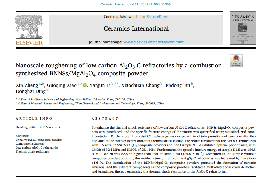 在深耕材料科学领域五年的时间中,她的成果不断获得行业认可。让郑欣倍感温暖与鼓舞的是,加入培华后,学校对科研工作给予了全力支持,为她搭建了施展专业才华的广阔舞台。今年带领团队在国际材料领域SCIE期刊《Ceramics International》发表题为《Nanoscale toughening of low-carbon Al₂O₃-C refractories by a combustion synthesized BNNSs/MgAl₂O₄ composite powder》的学术论文。这一期刊创刊于1971年,由Elsevier Ltd出版,在中国科学院分区中属材料科学大类2区,为材料科学权威Top期刊,影响因子5.6,是国际公认的材料科学权威刊物之一。