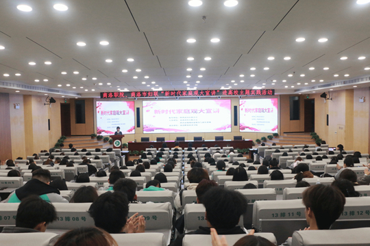 为引导广大青年学生形成积极健康的婚恋观与家庭观,12月4日下午,由陕西省妇女联合会指导,陕西省婚姻家庭服务与研究基地、商洛市妇女联合会联合主办,商洛职业技术学院承办的“新时代家庭观大宣讲”进高校主题实践活动在商洛职业技术学院图书馆报告厅举行。活动以“树立正确婚恋观,走好幸福人生路”为主题。商洛市妇联主席胡燕梅,商洛职业技术学院党委副书记、工会主席吴雪,副院长李承涛,陕西省婚姻家庭服务与研究基地负责人,西安培华学院女子学院副院长李蒙,骨干教师秦园,基地专家团成员及师生代表共200余人参加了活动。