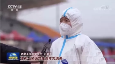 2021年12月31日,中央电视台《新闻联播》采访报道了西工大学生志愿者石雯萍。她平日里非常热爱公益事业。此次西安疫情暴发后,石雯她和很多同学一样,第一时间响应学校号召,投入到了志愿者队伍当中。