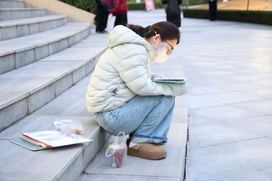 走廊间,台阶旁,有人低头默念,字句铿锵;有人静静合眼,梳理思绪。每一份专注,每一次呼吸,都在为这场奔赴积蓄力量。