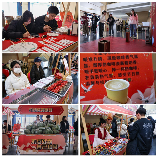 活动创新融合传统与创意,设置多个特色集市区域:书法集市中墨香四溢,同学们挥毫写下寓意吉祥的对联;投壶、套圈等趣味游戏让节日快乐翻倍;糖葫芦制作、咖啡体验区则充满烟火气;劳动教育成果集市里,同学们现场分发亲手种植的青菜;民族体验区更让师生近距离感受少数民族传统文化魅力。