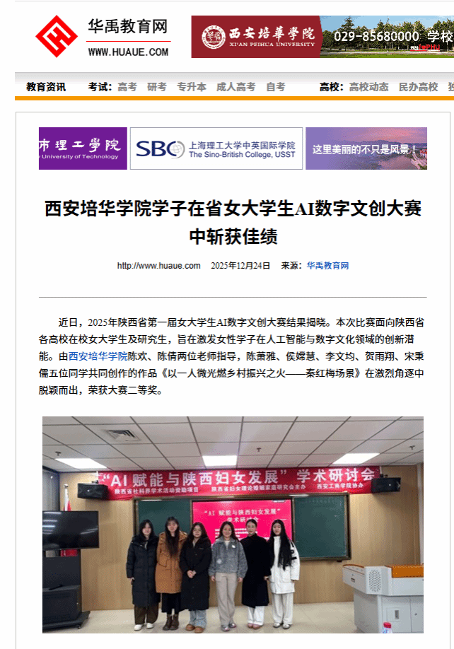 近日,2025年陕西省第一届女大学生AI数字文创大赛结果揭晓。本次比赛面向陕西省各高校在校女大学生及研究生,旨在激发女性学子在人工智能与数字文化领域的创新潜能。由西安培华学院陈欢、陈倩两位老师指导,陈萧雅、侯嫦慧、李文均、贺雨翔、宋秉儒五位同学共同创作的作品《以一人微光燃乡村振兴之火——秦红梅场景》在激烈角逐中脱颖而出,荣获大赛二等奖。
