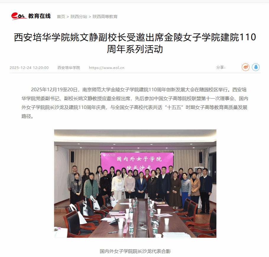 2025年12月19至20日,南京师范大学金陵女子学院建院110周年创新发展大会在随园校区举行。西安培华学院党委副书记、副校长姚文静教授应邀全程出席,先后参加中国女子高等院校联盟第十一次理事会、国内外女子学院院长沙龙及建院110周年庆典,与全国女子高校代表共话“十五五”时期女子高等教育高质量发展路径。