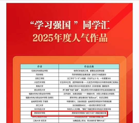 “学习强国”同学汇作为面向全国青年学子、汇聚高校优质内容的重要平台,其年度评选旨在表彰在理论宣传、思想引领、文化传播等方面表现突出的高校及作品。本次“最具传播力高校”荣誉,是对西安培华学院整体网络思政工作体系化建设、常态化运营及其广泛社会影响力的高度认可。而“年度人气作品”奖,则直接反映了其内容创作紧扣时代脉搏、贴近学生生活、引发情感共鸣的强大感染力。
